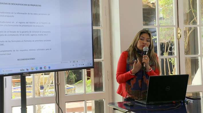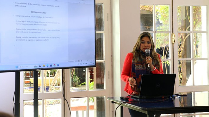 La jefa nacional de Gestión de Infraestructura, Guadalupe Cháve,z inició el evento con las palabras de bienvenida a los/las representantes de las empresas y asociaciones individuales que se presentaron para el taller que fue dictado por la responsable de Contrataciones de la FC-BCB ,Guadalupe Quintanilla Quelca.