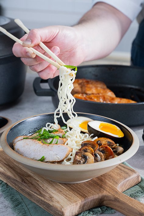 - Servir ramen con fideos, caldo, hongos, pollo y huevo. Decorar con verdeo.