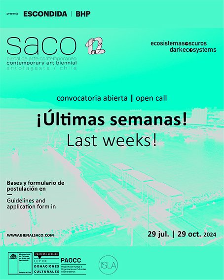 El formulario de postulación estará abierto hasta el 29 de octubre a las 23:59 horas (Chile continental). Más información en https://bienalsaco.com/convocatoria-bienal-saco1-2/.