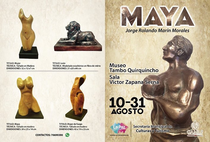 La exposición titulada “Maya”, nos muestra esculturas realizadas por el artista en diferentes técnicas, como ser soldadura, tallado en piedra, tallado en madera, modelado escultórico con vaciado en resina y fibra de vidrio. Según el artista el título de “Maya” se debe a que es la primera muestra realizada en la especialidad de Escultura, además de ser la que él considera su primera exposición ya como profesional.