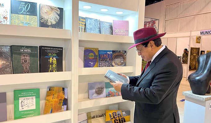 El presidente de la Fundación Cultural del Banco Central de Bolivia, Luis Oporto Ordoñez, visitó este atractivo stand que fue y es del deleite de todos los visitantes; con una instalación artística – conceptual por un lado, con tejidos locales, visibilizando por medio de las urdimbres la conexión entre el cielo y la tierra, evocando a los bienes materiales e inmateriales de los pueblos indígenas de los valles cochabambinos y por el otro lado, estantes blancos que tienen en el interior una variada oferta literaria resultado de la labor de los Repositorios Nacionales y Centros Culturales, dependientes de esta Entidad cultural, acompañado de un muro conmemorativo de nuestras valiosas mujeres.