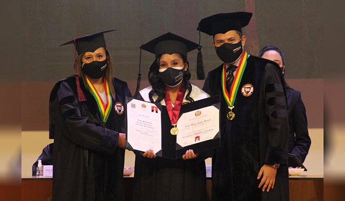 “Estoy muy contenta, feliz, por sacar a mis dos hijos profesionales, no tengo palabras”, aseguraba emocionada Willma Copa, madre de Luís y Sara; ambos hermanos comparten la pasión por la carrera de Ingeniería Comercial y recibieron juntos su título profesional luego de cinco años de estudio en UNIFRANZ El Alto.
