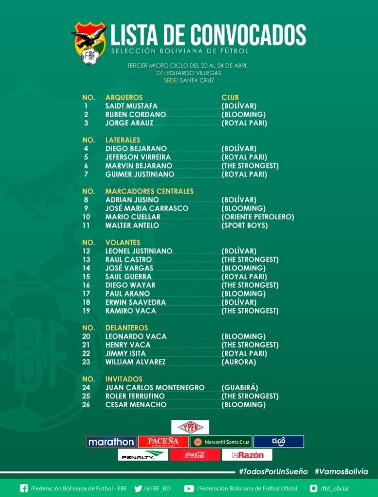 El seleccionador nacional Eduardo Villegas confirmó la mañana de este miércoles, una lista de 23 jugadores para un nuevo microciclo de trabajo de la Verde, antes de la Copa América.